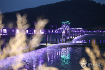 - 퍼플교는 신안군 안좌면 박지마을에서 평생 살아온 할머니의 소망이 담겨있는 다리이다. 할머니의 간절한 소원은 살아생전 박지도 섬에서 목포까지 두 발로 걸어가는 것이었다. 이후 2007년 신활력 사업으로 목교가 조성되었으며 반월, 박지도가 보라색 꽃과 농작물이 풍성한 사계절 꽃피는 1004 섬의 의미로 퍼플교로 불리게 되었다. 다리 중간에는 휴식을 취할 수 있는 팔각정과 낚시를 할 수 있는 공간도 있다. 밤이 되면 소망의 다리는 더욱 빛이 난다. 암흑이 드