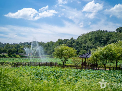 성주 초전면 뒷미는 조선 정조 원년 때 (1777) 박재춘(朴在春)이란 선비가 마을에 입향(入鄕)하고 마을 뒤에 형세가 좋은 산이 병풍처럼 둘러싸고 있어 그 산세가 인재를 양성할 수 있는 형이라 하여 마을 이름을 뒷미(後山)로 부르게 되었다. 그 마을 이름을 따서 뒷미지 수변공원으로 지었다. 뒷미지(후산지) 수변공원은 1970년대부터 연이 재배되고 있었던 연꽃자생지였으며, 습지가 많이 분포되어 있어 연꽃 재배의 최적지였다고 한다. 뒷미지수변공원은 백련, 홍련, 수련 등이 만발하여 정자와 구름다리, 분수, 미루나무 등이 어우러져 한 폭의 수채화 같은 아름다운 경관과 생태환경을 체험할 수 있도록 조성한 문화휴식공간이다. 흔들리는 바람 따라 수생식물들의 향기를 맡으며 힐링하는 시간을 가질 수 있다. (출처 : 성주문화관광)