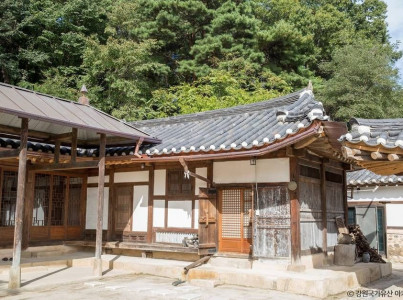춘천김정은가옥은 강원특별자치도 춘천시 신동면 솟발길에 위치한 전통 한옥으로, 강원도문화재자료로 지정되어 있다. 1920년에 건립되었으며, 최재근 전통가옥을 지은 목수가 시공한 것으로 전해진다. 이곳은 과거 도깨비 터로 알려졌으나, 현재 가옥 주의 선대가 집을 지은 후 등나무에 벼락이 치고 나무가 산 너머로 넘어간 사건을 계기로 집안이 번창했다는 이야기가 전한다. 가옥은 ㄱ자형 안채와 ㅡ자형 사랑채, 솟을대문으로 구성되어 있으며 영서 중부 지역의 전형적인 기와집 구조를 따르고 있다. 외부 공간의 배치, 목재의 치목, 부재의 크기까지 정밀하게 고려된 전통 건축 양식을 보여준다. 마당에는 단풍나무가 드리워져 있으며, 뒤편의 소나무 숲과 어우러져 고택의 운치를 더한다. 현재는 '춘천고택카페'라는 이름으로 활용되고 있어 전통 공간에서 커피를 즐길 수 있다. 내부는 전통 방식의 콩댐 온돌 구조를 갖추고 있으며, 중요무형문화재 장용훈 장인이 만든 창호지로 마감된 방도 있다. 창호 문을 통해 자연 채광과 고택의 정원을 감상할 수 있도록 설계되었다. 이 고택은 예약제로 운영되며, 방문객들은 전통문화와 일상을 동시에 체험할 수 있다.