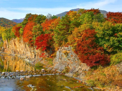 깎아지른 절벽이 병풍처럼 펼쳐져 있어 신성계곡의 대표적인 절경 중 하나로 꼽히는 만안 자암 단애는 청송군 안덕면 만안 마을에 있는 붉은 바위 절벽을 의미한다. 자암을 이루는 암석은 중생대 백악기의 퇴적암으로 수직 방향으로 암석에 생긴 틈인 절리가 많이 발달하며 퇴적구조는 찾아보기 어렵다. 자암의 붉은 색은 못이 시간이 지나 붉게 녹스는 것과 같이 암석에 포함된 철 성분이 지표면에서 오랜 세월동안 풍화를 받으며 산소와 만나 산화하면서 붉게 변한 것이다. (출처 : 국가지질공원)