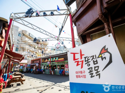 대구는 양념통닭과 간장치킨의 발상지고 치맥을 축제로 승화시킨 치맥페스티벌의 중심지이며 서민들의 애환과 함께 성장해온 전국 유일의 닭똥집골목인 대구평화시장닭똥집골목은 50여년의 역사를 지닌 곳이다. 1972년 삼아통닭은 넉넉잖은 형편의 인력시장 노동자들에게 장사를 하다가 남은 닭똥집을 튀겨 막걸리 안주로 내어 주었는데 반응이 좋아 정식 메뉴가 되었다. 가난한 노동자들을 위로하기 위해 만들었던 음식이 닭똥집 골목 역사의 첫 출발이었다. 삼아통닭 닭똥집의 인기가 높아지면서 주변의 음식점들이 모두 닭똥집을 파는 가게로 변하게 되어 닭똥집 골목이 형성 되었고 이를 원조골목이라고 부른다. 90년대 들어오면서 당시 근처에 마땅히 갈 곳이 없던 대학생들은 재래시장의 선술집 분위기와 저렴한 가격, 푸짐한 인심을 즐기며 이곳을 찾아 청춘의 추억을 쌓았고 골목의 인기가 높아지자 주변 골목도 닭똥집 가게들로 채워졌다. 2000년대 들어오면서 간장똥집, 마늘똥집 등 새로운 감각의 닭똥집 전문점이 생겨나기 시작하면서 동성로만 찾았던 젊은이들의 모임 장소로 유명해 지게 되었다. 젊은층이 많이 찾으면서 그들의 입맛에 오징어똥집, 새우똥집, 문어똥집 등 다양한 퓨젼요리가 판매되었다. 이렇게 이어져 온 닭똥집골목은 어르신들에게는 추억의 장소, 젊은이들에게는 가성비가 좋고 맛있는 음식이 즐비한 젊음의 거리, 관광객들에게는 닭똥집에 대한 새로운 인식을 경험하게되는 곳으로 꼭 한번은 방문해야 할 대구를 대표하는 먹거리 골목이다. 동대구역이 인접하여 접근성이 매우 뛰어나며, 주변으로 금호강변에 동촌유원지를 비롯해 기상대 기념공원 등이 있어 휴식공간도 같이 즐길 수 있으니 시장에 들러 특별한 오감을 즐겨보자.