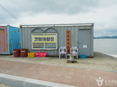 태안에는 갯벌을 체험할 수 있는 곳이 많은데, 그중 진산리어촌계는 맛조개가 잘 잡히는 유료 어장이다. 진산리어촌계 갯벌체험장은 진산리어촌계와 행복마트 두 군데로 나뉜다. 입구가 각각 나뉘지만 같은 갯벌체험장이다. 체험전에는 물때 시간만 잘 확인하고 간편 복장으로 방문하면 필요한 장비들은 모두 대여가 가능하다. 주민분들이 맛조개 잡는 방법을 설명해 주시기도 하고, 간단한 팁을 알려 주신다. 발이 빠지는 갯벌이 아니라 아이들도 부담 없이 멀리까지 걸어 나가서 체험할 수 있고, 조개 외에도 다양한 종류의 이름 모를 물고기, 고동, 소라게 등 해양생물들을 볼 수 있는 소중한 경험을 할 수 있다. 입구 쪽에 간단히 발과 장화를 씻을 수 있는 공간도 마련되어 있어 편리하다. 또 해가 지는 시간이라면 이곳에서 일몰 또한 놓쳐서는 안 될 코스이다. 노을 지는 아름다운 풍경을 보며 힐링하고, 멋진 추억을 만들 수 있다.