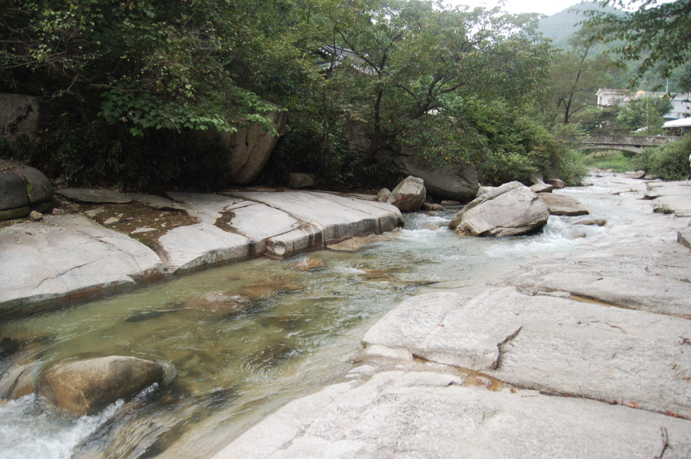 맑은 물들이 평탄한 바위 사이로 흐르는 것을 보니