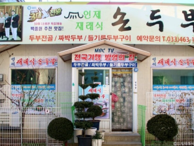 강원도 인제군 인제산촌민속박물관에서 가까운 손두부 맛집이다. 인제에서 나는 콩만 사용하여 매일 두부를 만들어 요리에 사용한다. 대표 메뉴는 손두부로 만든 짜박두부와 들기름 두부구이다. 아침 10시 오픈과 동시에 테이블이 다 차는 곳으로 백종원의 삼대 천왕을 비롯해 여러 프로그램에서 소개한 곳이다. 짜박두부는 찌개보다 국물이 적어 자박자박하고 칼칼한 양념으로 끓여 먹는데, 다른 반찬이 없어도 밥 한 공기를 비울 수 있다. 물론 기본 찬으로 강원도식 밥반찬들도 정갈하게 잘 나온다. 들기름 두부구이는 도톰한 손두부를 들기름으로 구워내는데 고소하고 건강한 맛이다.