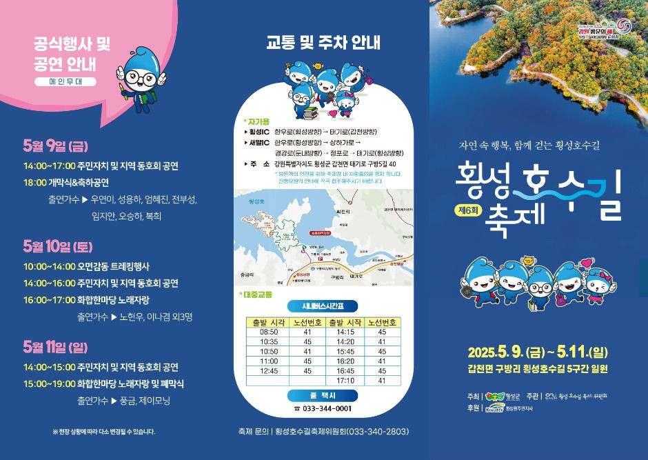횡성호수길축제는 강원특별자치도 횡성군의 자연경관을 배경으로 펼쳐지는 대표적인 지역축제이다. 맑고 고요한 횡성호수와 둘레길을 중심으로 다양한 체험과 공연, 걷기행사(트래킹)프로그램이 마련되어 있다. 지역 주민과 방문객이 함께 어우러지는 소통과 화합의 장으로 자리매김하고 있다. 매년 5월, 자연 속에서 여유와 문화를 동시에 즐길 수 있는 힐링형 축제로 평가받고 있다.