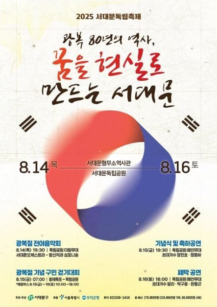광복 80주년을 맞아 2025 서대문독립축제가 8월 14일(목) 부터 16일(토)까지 3일간 서대문형무소역사관, 독립공원 일대에서 열린다. "광복 80년의 역사, 꿈을 현실로 만드는 서대문구" 라는 주제로 순국선열의 희생정신을 기리고, 다양한 경축 문화 행사를 개최하여 광복의 기쁨을 시민들과 함께 나누는 대표 역사문화축제이다.댓글목록