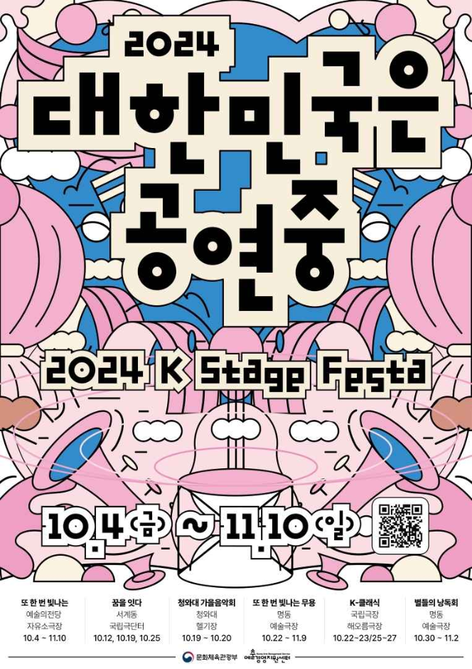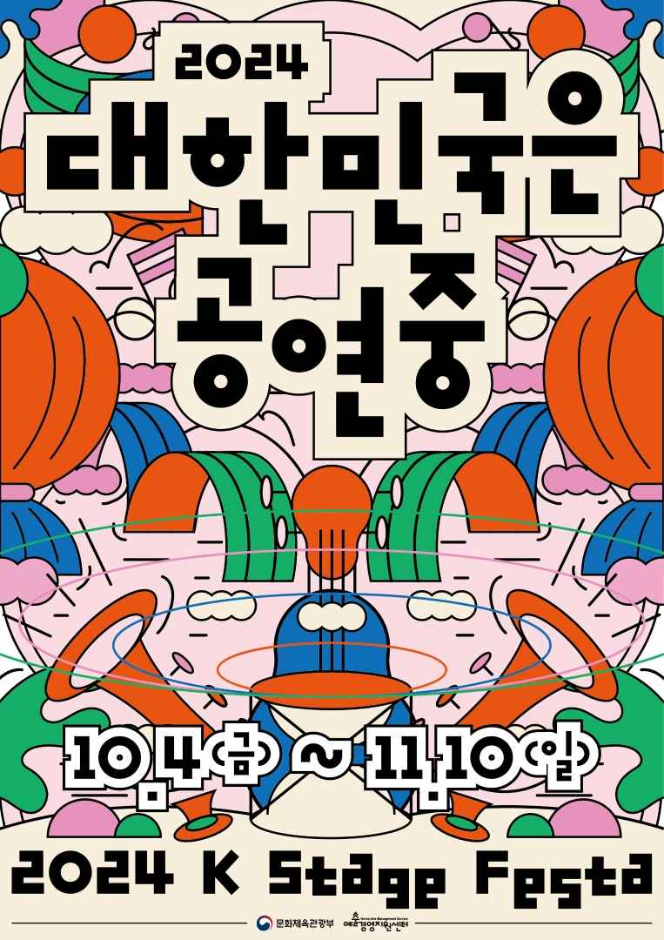 - 올해 처음 선보이는 〈2024 대한민국은 공연중〉은 공연 최성수기인 10월에 열리는 주요 공연예술 행사와 전국 곳곳에서 진행되는 공연을 연계하여 소개하는 통합 공연예술축제이다. 국립극장, 예술의전당, 명동예술극장, 청와대, 서계동 옛 국립극단 터에서 대표 공연을 선보이며, 주요 공연예술 행사인 서울아트마켓, 서울국제공연예술제, 웰컴대학로 등 국내외 공연예술 및 공연관광 분야를 확인할 수 있다. 더불어 전국 문예회관과 공연장에서 진행하는 다양한 공연을 대