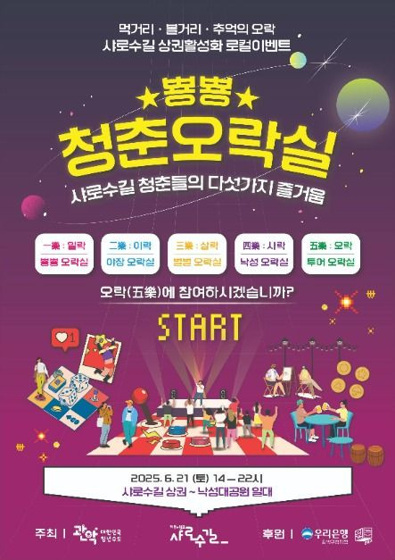 - 샤로수길 상권활성화 로컬이벤트는 서울 관악구 샤로수길 골목상권의 유동인구를 늘리고 지역 경제에 활력을 불어넣기 위해 기획된 지역 밀착형 행사이다. 상권 내 소상공인들이 직접 참여해 스탬프 투어, 야장 운영, 거리공연 등 다양한 프로그램을 진행하며, 방문객이 자연스럽게 상점을 순회하고 머무르도록 유도한다. 특히 지정된 매장에서 미션을 수행하며 도장을 모으는 스탬프 투어는 골목 곳곳에 생동감을 더하고, 야외 테이블과 버스킹 공연은 체류 시간을 늘려 소비 활