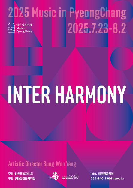 강원특별자치도가 주최하고 (재)강원문화재단이 주관하는 2025 평창대관령음악제(예술감독 양성원)가 7월 23일(수)부터 8월 2일(토)까지 11일간 평창군 대관령면 알펜시아 콘서트홀과 대관령 야외공연장(뮤직텐트)을 비롯한 강원특별자치도 일대에서 개최된다. 올해는 ‘인터 하모니 Inter Harmony(조화의 나눔: 경계를 넘는 음악적 영감)’를 주제로 다른 나라, 타지역의 전통과 문화 등에서 영감을 받아 명곡을 남긴 위대한 작곡가들의 작품을 선보일 예정이며, 음악을 통해 인류가 하나가 되고, 서로 간의 차이점들이 더욱 아름다운 유산을 남기는 비전을 제의한다. 21회의 <콘서트>, 9회의 <찾아가는 음악회>, 대관령아카데미-시즌 교육프로그램 ‘실내악 멘토십 프로그램’과 ‘마스터클래스’와 5회의 <찾아가는 가족음악회>, 그리고 <특강> 등 다채롭고 풍성한 행사들이 펼쳐진다.