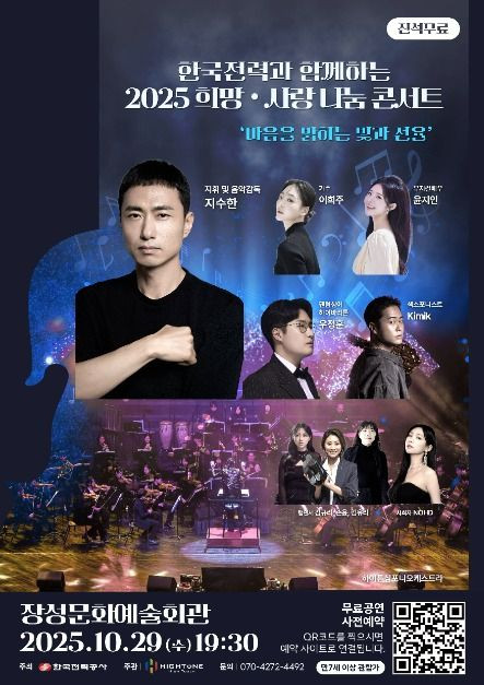 한국전력공사와 함께하는 2025 희망·사랑 나눔 콘서트가 장성문화예술회관 대공연장에서 전 좌석 무료로 개최된다. 이번 공연은 취약계층과 지역사회와의 동반성장, 그리고 지역 문화예술 발전에 기여하고자 마련된 뜻깊은 무대이다. 가수 NOHD의 사회로 진행되는 이번 무대에는 50인조 하이톤 심포니 오케스트라가 웅장한 선율을 선사하며, 뮤지컬 배우 윤지인·우정훈, 가수 이희주, 색소포니스트 김소폰 등이 함께해 다채롭고 풍성한 무대를 완성한다. 특히 이번 콘서트