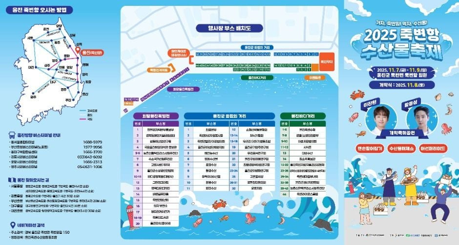 죽변항 수산물축제는 울진군 죽변항 일원에서 11월 7일부터 11월 9일까지 개최되는 지역 대표 축제이다. 울진의 신선한 수산물을 주제로 다양한 체험과 공연, 경매 프로그램이 진행되는 축제이다. 주요 프로그램으로는 맨손 활어잡기, 수산물 해체쇼, 물회 퍼포먼스, 바다공방 체험 등이 있으며, 개막축하공연에는 이찬원과 황윤성이 출연한다. 축제 기간 동안 울진의 바다를 배경으로 한 어선 퍼레이드와 수산물 즉석경매가 진행되어 풍성한 볼거리와 먹거리를 제공한다. 또한 희망울진특별전, 울진군 화합의 거리, 울진바다거리 등 다양한 테마 부스가 운영되어 지역 수산물과 특산품을 한자리에서 만날 수 있다. 본 축제는 지역 어민과 관광객이 함께 어우러지는 화합의 장으로, 울진 수산업의 우수성과 지역경제 활성화를 목표로 하고 있다.