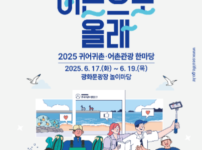 "귀어귀촌 어촌관광 한마당 ? 어촌으로 올래"는 도시민들이 도심 한복판에서 어촌의 매력을 직접 체험하고 귀어귀촌이라는 새로운 삶을 상상해볼 수 있는 참여형 문화행사이다. 광화문 해치마당과 놀이마당 일대에서는 귀어귀촌 일자리 상담부터 어촌 특산물과 관광상품 전시, VR 체험, 바다 조각으로 만드는 DIY 작품, 귀어귀촌 유형테스트 ‘어비티아이’ 등 온 가족이 함께 즐길 수 있는 다채로운 프로그램이 펼쳐진다. 전국 어촌 지역의 부스를 방문하면 각 지역의 특색 있는 특산물과 콘텐츠를 만나볼 수 있으며, 귀어귀촌 캐릭터 ‘귀어해’와 함께 사진을 찍는 추억도 남길 수 있다. 행사 무대에서는 호흡 명상 테라피를 하며 힐링할 수 있는 싱잉볼 명상부터 귀어인의 생생한 경험을 나누는 토크쇼, 도심 속 힐링 버스킹, 귀어벨을 울려라 같은 참여형 이벤트까지 다양한 공연과 프로그램이 운영된다. 행사장을 구석구석 걸으며 모바일 스탬프 미션을 완료하면 기념 선물도 받을 수 있으며, 저녁 시간대에는 수산물 시식과 간식 타임이 마련되어 도심에서 어촌을 보고, 듣고, 맛보는 오감만족의 시간을 선사한다.