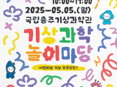 제103회 어린이날을 맞아 오는 5월 5일(월), 어린이와 가족을 위한 기상과학 체험 축제 ‘기상과학 놀이마당’ 행사를 개최한다. 어린이들이 날씨와 기후에 대한 호기심을 쉽고 즐겁게 배울 수 있도록 다양한 체험 중심의 프로그램을 포함하여 과학마술공연, 특별영상 상영, 캐리커처 및 페이스페인팅 체험 등을 통해 과학적 상상력과 창의력을 자극할 수 있는 기회를 제공한다. 주요 프로그램으로는 ▲너디더비레이싱 게임 ▲태양관측 망원경 체험 ▲야외 체험부스(3종) ▲레고 풍력자동차 만들기 ▲이동과학버스 체험 ▲사이언스매직 렉처 콘서트 ▲캐리커쳐 체험 ▲페이스페인팅 체험 ▲특별영상 등의 다양한 프로그램이 운영된다.