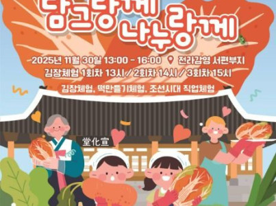 온 동네가 모여 떠들썩하던 옛 김장철의 정취가 다시금 전라감영에 살아난다. 11월 30일, 전라감영 서편부지에서 펼쳐지는 는 김장 체험을 중심으로 퍼포먼스 · 전통놀이 · 공연 등이 어우러진 다채로운 역사 활용 프로그램들로 구성되어 있다. 마을 공동체 문화의 따뜻한 감성을 현대적으로 풀어낸 특별한 자리로, 예부터 이웃들이 한데 모여 손맛을 보태고 정을 나누던 '김장 공동체'의 풍경을 되살리고자 한다. 이날 김장 체험을 통해 만들어진 김치는 지역 내 취약계층에게 전달될 예정이며, 참여자들은 김치를 함께 담그고 나누는 과정을 통해 공동체의 의미를 다시 한 번 몸소 느끼고, 서로를 돌보고 마음을 나누는 전통의 가치가 지역 사회에 온기를 더하는 특별한 하루를 선사하고자 한다.