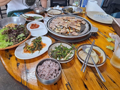 유가네흑돼지는 일산서구 덕이동에 있는 돼지고기 전문점이다. 식당 앞에 주차 공간은 넉넉하다. 메뉴는 모듬생고기, 김치두루치기, 김치찌개, 된장찌개, 잔치국수, 열무국수가 있다. 모듬생고기는 초벌구이해달라고 얘기하면 노릇하게 구워서 갖다준다. 장아찌류, 콩나물, 마늘, 고추, 쌈장과 투박한 그릇에 묵은지가 포기로 담겨서 기본 찬으로 차려진다. 생고기는 초벌구이 되어 있어서 빠르게 굽기 좋다. 묵은지 구워서 고기와 곁들여 먹으면 맛있는 한쌈이 완성된다. 식사 메뉴로 된장찌개나 잔치국수를 시켜 먹으면 된다.