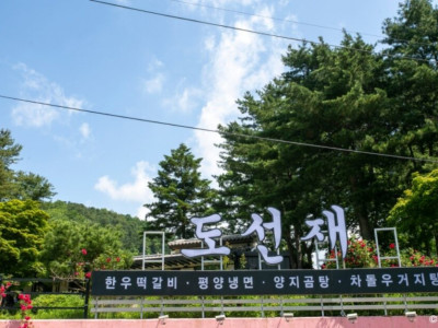 도선재는 가평군 청평에 있는 한식집으로 쁘띠프랑스에 가까이 있다. 평양 출신의 할머니가 해 주시던 집안 내림 음식 평양냉면과 담양 처가의 떡갈비를 주메뉴로 부부가 식당을 열었다. 음식을 정성껏 만든 후 가장 먹기 좋게 만들어 상에 내놓고 있다. 음식이 자극적이지 않고 맛이 있어서 아이들과 먹기 좋다. 주문하고 음식이 나올 때까지 시간이 좀 걸린다. 청평 근처 풍광 좋은 터를 잡은 식당으로, 내부는 현대적이지만 외부에서는 한옥처럼 보인다. 정원은 정성껏 가꿔 사계절의 아름다움을 모두 느낄 수 있다. 이곳에서 기르는 11마리의 고양이가 곳곳에 보인다. 많이 유명한 식당이어서 항상 대기가 있는 집이다. 대기를 하는 동안 잘 가꾼 정원을 즐기며 기다리면 된다. 널찍한 주차장은 식당 앞에 있어 주차하고 아름다운 정원을 통해 식당으로 이동하면 된다.