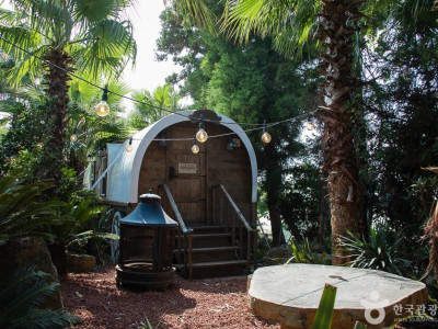 대정읍 추사로에 위치해 있고 바로 앞에 산방산과 단산이 보이는 3대째 이어져 오는 제주도 귤밭으로 카페는 감귤로 실내 인테리어가 되어 있다. 실내 카페공간을 나오면 이국적인 정취가 느껴지는 야자나무밭과 화산송이로 이루어진 길을 따라 곳곳에 해먹의자, 침대의자들과 테이블이 넉넉하게 있어 여유롭다. 나무들 사이 곳곳에 다양한 조형물들이 있는 포토존과 아이들이 타고 놀 수 있는 유아용 트랙터, 마차 속 카페와 구석구석 예쁜 길을 찾아다니는 재미도 있어서 아이와 함께한 가족여행지로 인기가 높다. 음료를 주문하면 야외 넓은 공간에서의 동물 먹이 주기 체험도 가능하고, 야외 중앙에 있는 화로대에서 마시멜로우도 구워 먹을 수 있으며 군고구마 파는 곳도 있어 다양한 경험을 할 수 있는 가성비 높은 이색적인 카페이다. 오후 5시 넘어 일몰이 지기 시작하고 조명이 켜지면 야외의 감성 캠핑장 느낌이 물씬 풍겨나기도 한다.