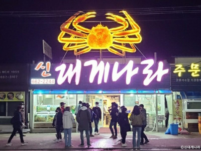신대게나라는 강릉시 주문진항 근처 도깨비시장에 있는 해물요리 전문 식당이다. 주메뉴는 대게, 킹크랩, 랍스터, 박달 홍게를 쪄서 먹는 메뉴이다. 입구에 있는 수족관에서 마음에 드는 게 종류와 크기를 정하면 반찬과 게찜을 차려 내온다. 반찬으로 나오는 음식은 샐러드, 새우볼, 흰 골뱅이, 모둠회, 해초면 등이 나온다. 반찬을 먹고 있으면 정갈한 편백찜기에 쪄서 주문한 게가 나온다. 먹기 좋게 손질돼서 제공하므로 편하게 먹을 수 있다. 딱지에 붙은 내장에 밥을 비벼 먹으면 맛이 훌륭하다. 마무리로 홍게라면을 먹으면 시원하고 칼칼한 맛에 속이 편안해진다. 주차는 건물 바로 앞에 할 수 있다.