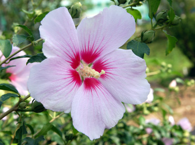 기본 정보 식물명 : 무궁화 '충무' 학명 : Hibiscus syriacus 'Chungmu' 과명 : 아욱과 (Malvaceae) 자원구분 : 재배품종 분류체계 : 피자식물문 > 쌍자엽식물강 > 아욱목 > 아욱과 > 무궁화속