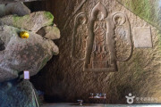 • 거창 가섭암지 마애여래삼존입상은 금원산 북쪽 골짜기 큰 바위굴에 새겨져 있는 마애삼존불이다. 뒤의 돌계단을 오르면 바위굴이 있고, 안쪽 남향 바위에 삼존불이 새겨져 있다. 삼존불의 부분을 삼각선으로 그어 구획하고, 가운데는 보주형으로 다듬어 세 분의 부처를 새겼다. 중앙의 부처가 두 보살을 좌우로 거느린 모양이다. 중앙은 아미타여래, 오른쪽은 관음보살, 왼쪽은 지장보살로 보인다. 연꽃 수미단 대좌 위의 본존불은 얼굴인 넓적하며, 얼굴에 비해 작은 눈, 코, 입, 크지만 밋밋한 귀가 토속적 인상을 준다. 좌우 보살의 얼굴도 비슷한데 화려한 옷자락은 조금은 번잡한 느낌이다. 삼존불 모두 도드라지게 새겼으나, 전체적으로는 납작하게 표현되었다. 본존불의 각진 어깨, 밋밋한 가슴, 부자연스럽게 가슴에 모은 팔, 막대 같은 다리, 좌우로 벌린 발등 표현은 고려시대 부처상의 특징이다. 오른쪽에 새긴 글에는 1111년에 제작한 것으로 되어 있고, 바위굴 아래의 가섭암 자리는 1770년 대까지 절이 있었다고 하며, 당시의 것으로 보이는 몇 개의 석재가 남아 있다.