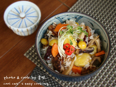 새송이와 표고를 메인으로 밤, 대추, 호두, 은행등등.. 영양 많고 맛있는 재료들을 함께 넣어 '별미 버섯 영양밥'을 지어 봤습니다. 재료 ★ 찹쌀 1컵, 멥쌀 1컵 , 밤 7개, 대추 한줌, 은행 12알, 당근 한 토막, 호두 한줌, 새송이 2송이, 건표고 3장, 들기름, 다시마 육수 .. 무순(옵션..) ★ 양념장 : 다시마 육수 1큰술, 간장 3큰술, 맛술 1큰술, 다진 청량고추, 홍고추 1개씩, 다진 마늘 1큰술, 설탕 한꼬집, 통깨 1큰술, 다진 쪽파 1큰술, 들기름 1큰술.. 엄휘~~ 조노무 스킬렛.. 조고 왜 글케 무거운 거야용..? 증말~~ 죽 묵고는 들지도 몬하겠시용..ㅜ 아주 손목 나가는 줄 알았다능..ㅠㅠ 확~~엿 바꿔 묵어부럿..ㅋ 그럼 다시~~ㅎ 밥알이 으깨지지 않도록 조심 조심 고루 섞어서 밥을 푸고.. 매콤 고소한 양념장도 솔솔~~ 전 들기름향이 넘 좋더라구용..ㅎ 들기름이 싫으시면 참기름을 사용하셔도 됩니당..^^ 고루 고루 비벼서 한 큰술 듬뿍~~ 넘 맛있어 보이시죵..? ^^ 쫄깃한 버섯에 달콤한 밤.. 게다 고소한 호두까지 오도독 씹히는 그 맛이란..ㅎ 요래 요래 김치까정 얹어서 묵음 그야말로 환상이지용..^^ 조오기 사진 속의 맛난 명품김치.. 울 여울빛 언니네서 얻어온 아이랍니당.. 언니네 김치가 정말 정말 맛있거든요..^^ 손 큰 언니가 마이도 싸줬건만 그날 이후.. 맛나다공 요걸로만 밥을 묵어서리 벌써 반이나 없어져 버렸어욤.. ㅜ 내가 묵어놓고 아까워 하는건 또 뭐람..헤~ 이젠 아껴 묵어야 겠어용..^*