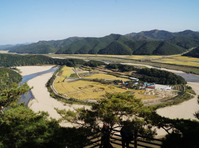 이 계단을 오르면 어디가 나오는 걸까요? 회룡포전망대 입니다. 예천군 용궁면 향석리에 위치한 전망대로물돌이 마을인 회룡포마을을 한눈에 볼 수 있어마을보다 더 유명한 곳입니다. 전망대에서 본 회룡포마을입니다. 정말 멋지지않나요? 벼들이 황금물결을 이루다보니 더 아름답네요 벼로 그림이 그려져 있네요~^^예천을 홍보하는 글귀네요~역시 전망대에 많은 사람들이 찾아오니전망대에 볼 수 있게 만들어놨네요~~ 회룡포마을이 가장 잘보이는 포인트 지점에 정좌가 있는데요 저도 거기서 촬영을 했어요~ 바로 요녀석입니다.^^여기는 1박2일 촬영했던 장소이기도 하죠~이제는 저 아래로 회룡포 마을로 가보실까요?
